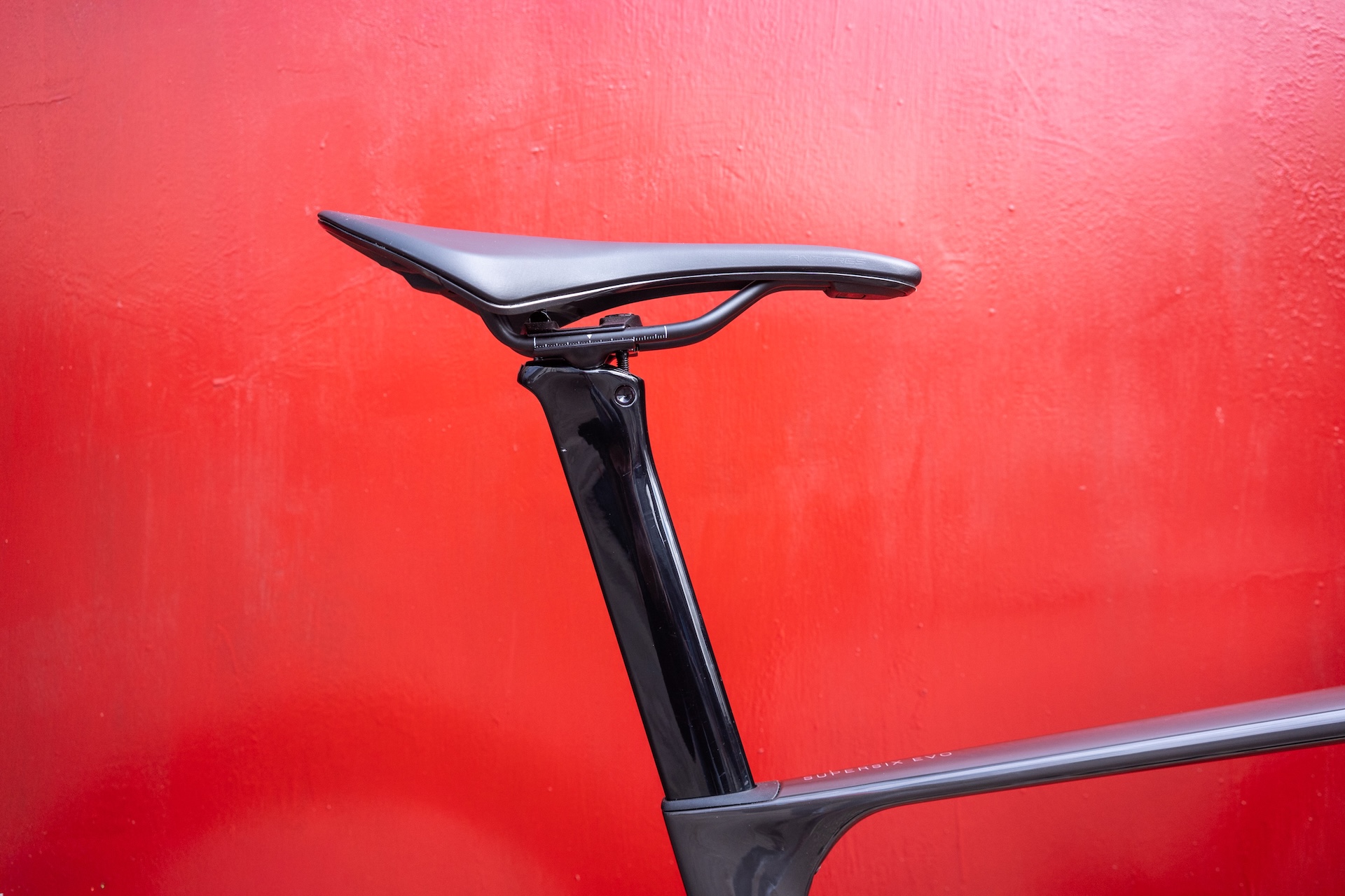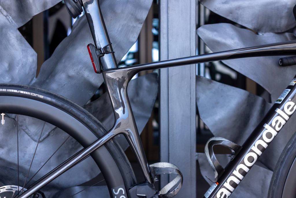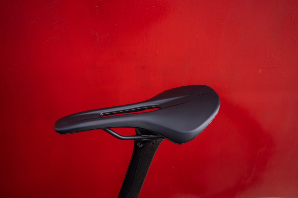 - Sztyca i siodło. Karbonowy wspornik Cannondale C1 Aero 40 Carbon V2 o profilu ściętej łezki, zwieńczony wyścigowym siodłem Fizik Vento Antares R7 (szerokość 140 mm).