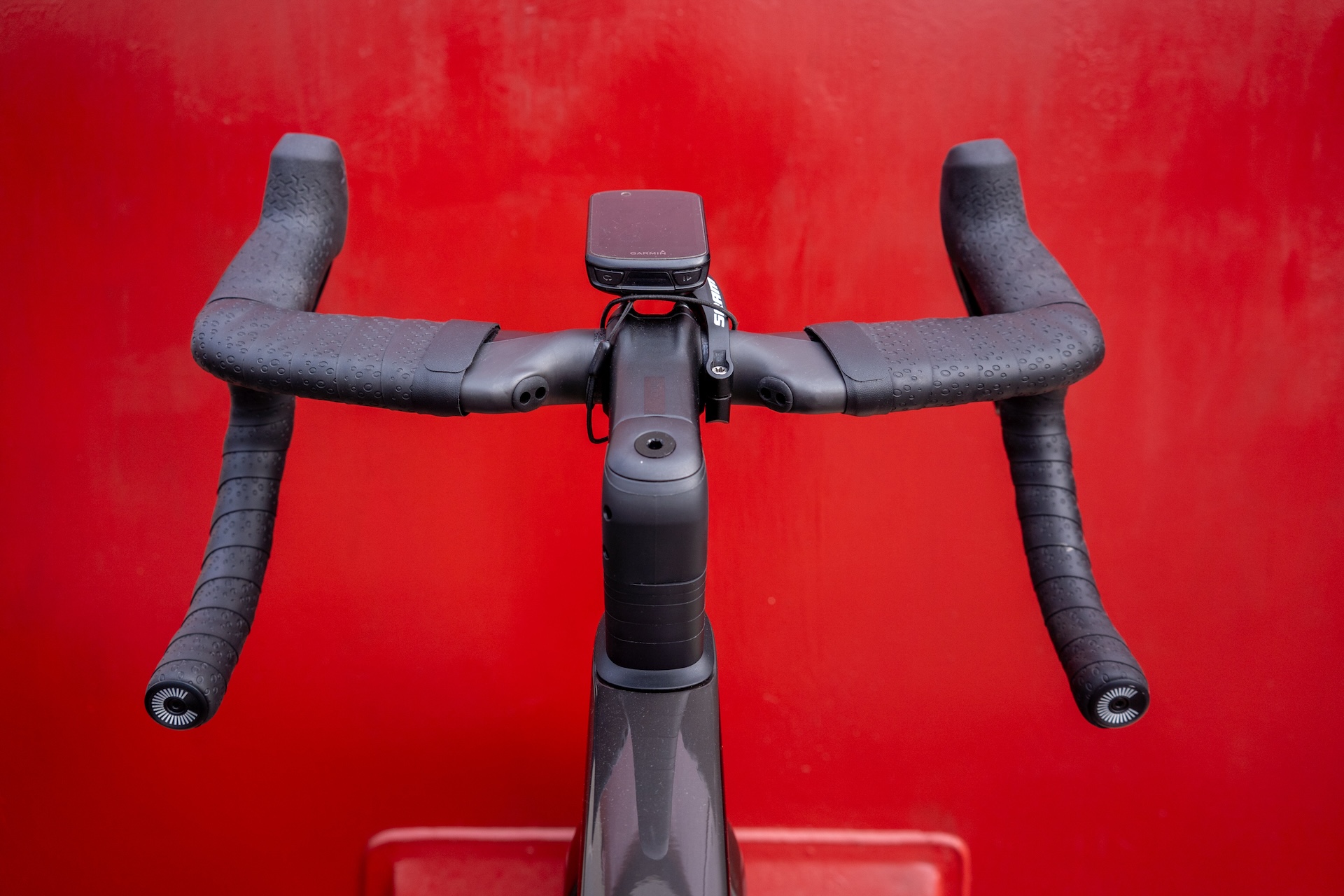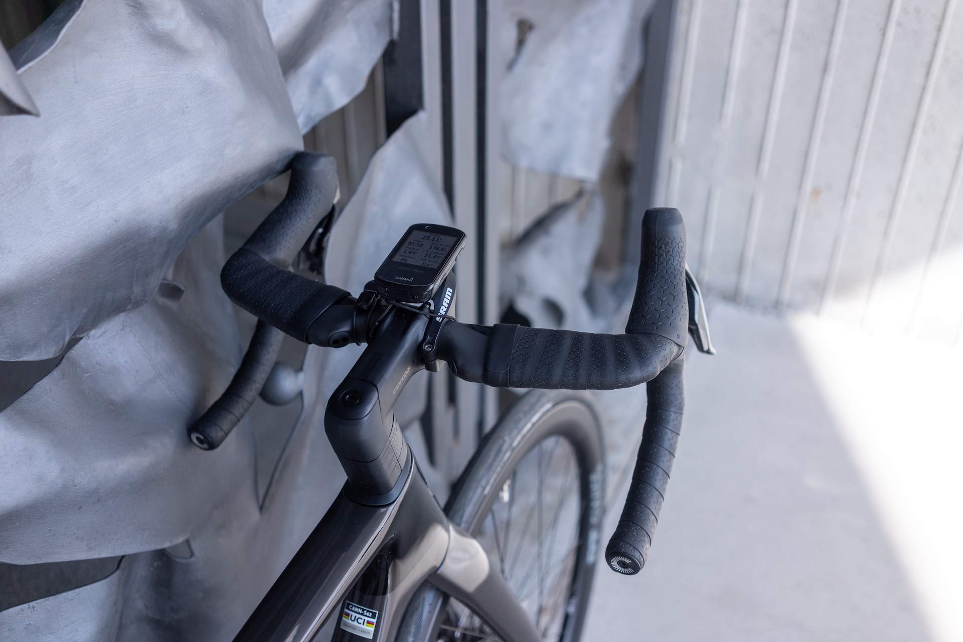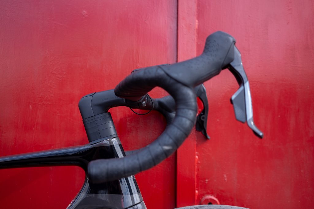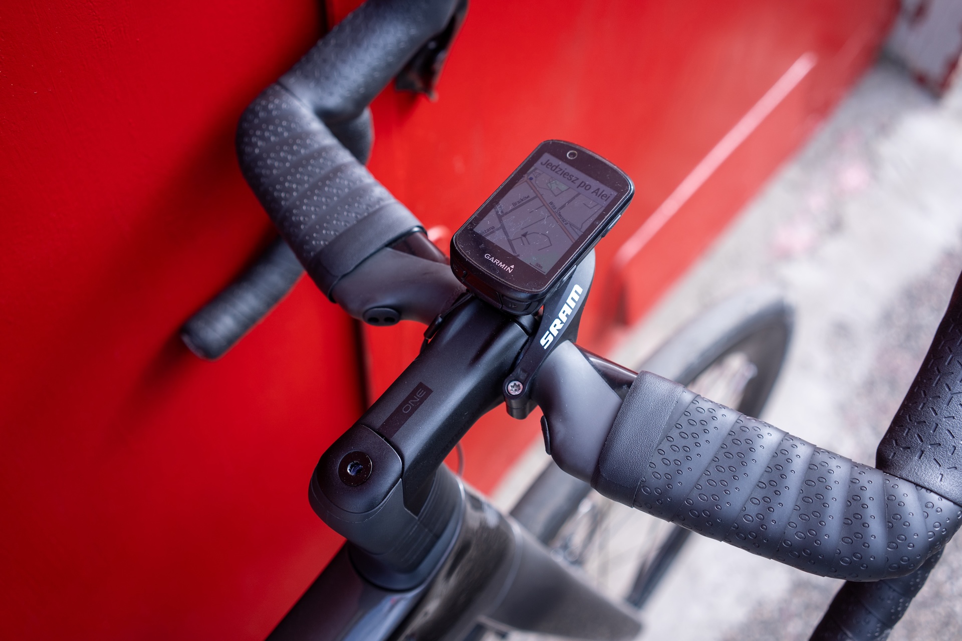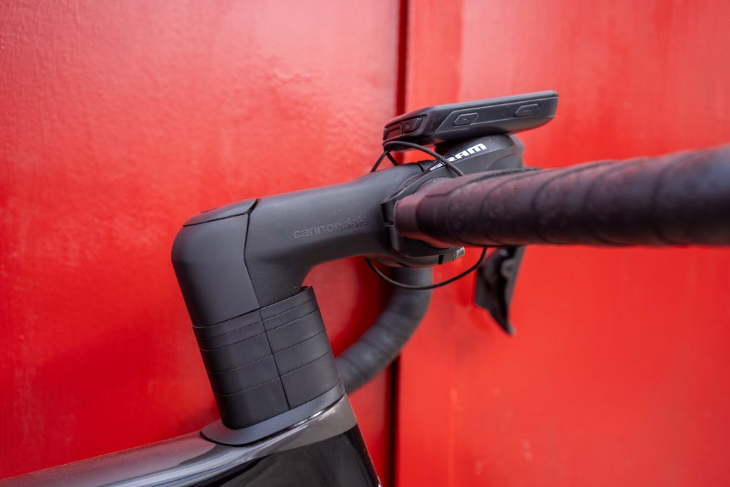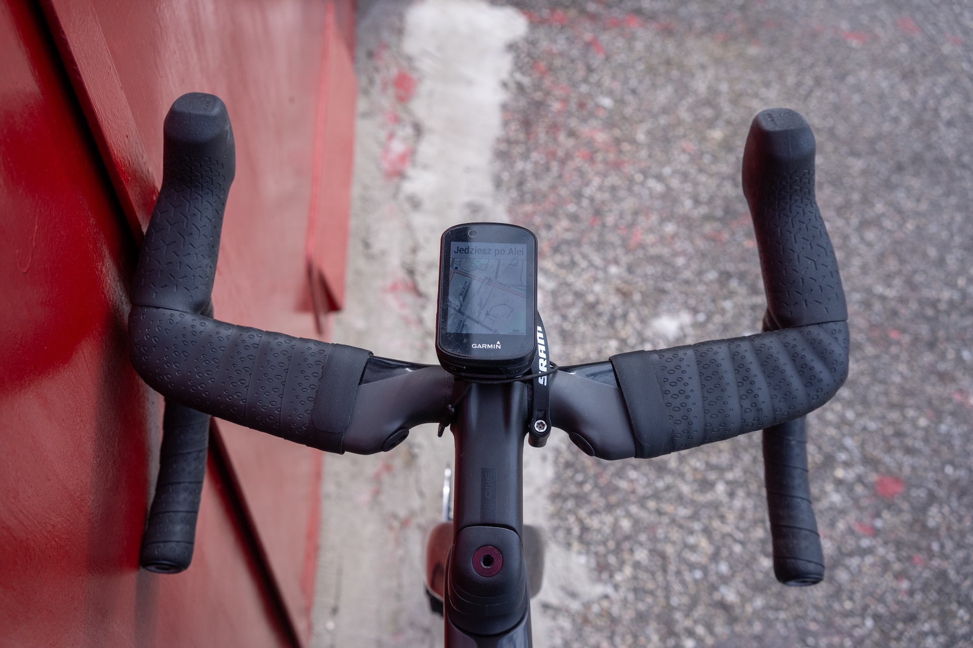 Co mnie ujmuje w tym zestawie? Aerodynamiczna kierownica, połączona ze standardowym mostkiem z płytką na 4 śruby, przybiera w środkowej części okrągły przekrój. To pozwala na zamontowanie klasycznego uchwytu na licznik i klasycznej, nawet supermarketowej lampki. „Dozgonna wdzięczność”. Zintegrowany kokpit to piękna rzecz, ale nadaje się jedynie do patrzenia (do widzenia); jakikolwiek wyścig ultra, nocna eskapada, nie mówiąc o bikepackingu, to udręka. Tego nawet nie da się ładnie okleić folią ochronną (taśmą izolacyjną na okrętkę jedynie). W SuperSix EVO 4 wspaniale się wszystko mieści i trzyma, a szerokie płaty top bara dają odpocząć dłoniom na długich prostych i podjazdach.