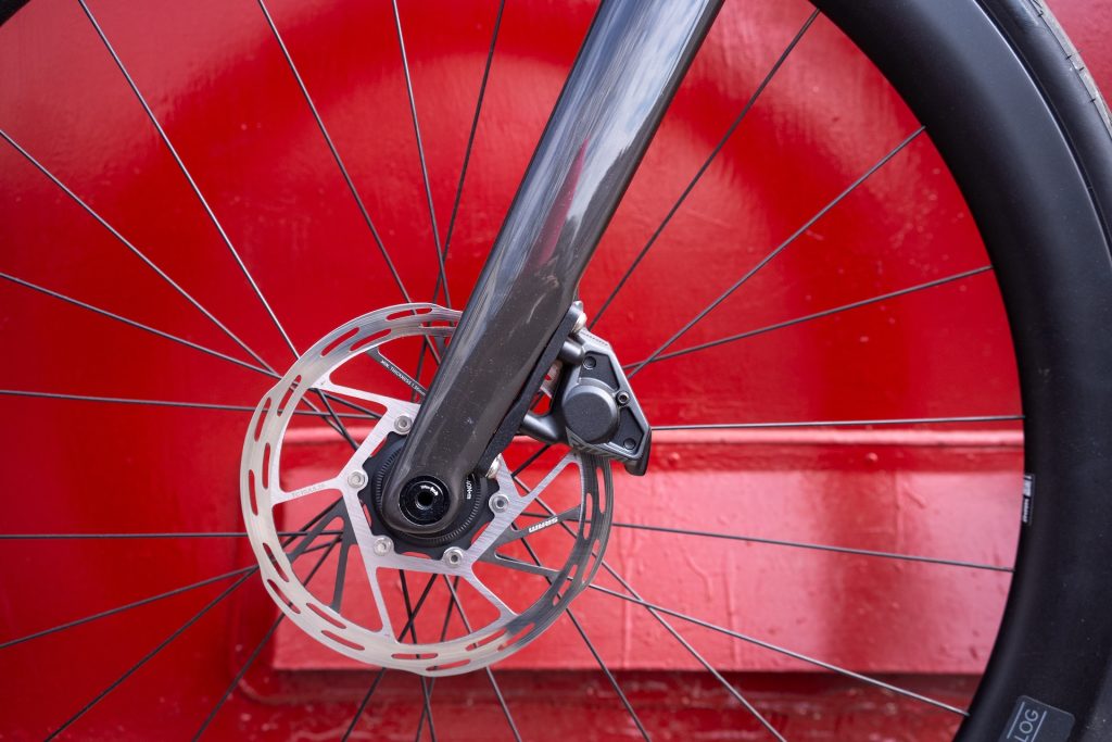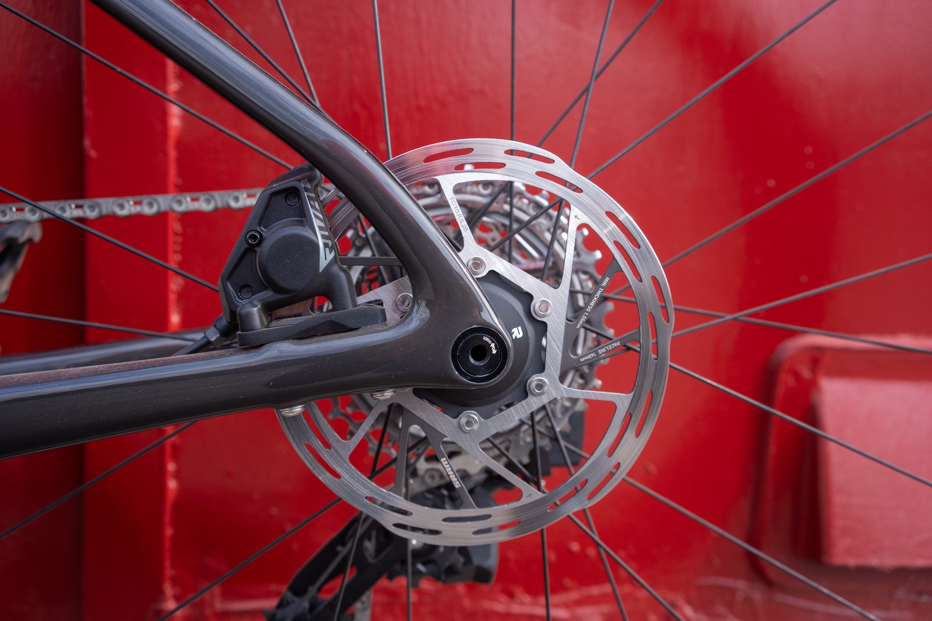 Pełny elektroniczny SRAM Rival AXS 2×12, z szerokim zakresem pod górę, pancernym suportem na gwincie i hamulcami tarczowymi do kompletu. Żadnych miksów, czysta grupa i tarcze 160 mm. Korba 48/35 T z ramionami o długości 170 mm w przypadku testowanego rozmiaru 52 w połączeniu z kasetą 10-36 T daje szeroki zakres i przełożenia miększe niż 1:1 – o takie przełożenia w szosie wykłócałam się z kolegami-mechanikami przez ostatnie 15 lat.