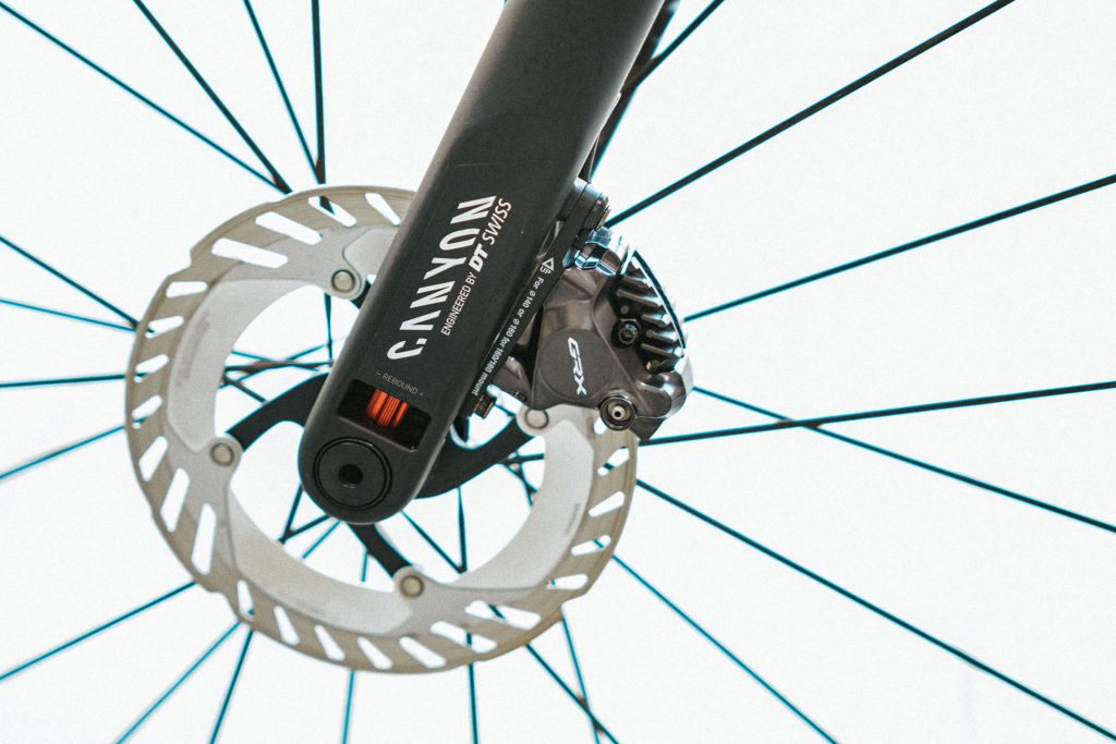Na uwagę zasługuje sposób integracji widelca. Model DT Swiss F 132 ONE wykorzystuje konstrukcję Reverse Arch. Przy ustawieniu koła na wprost, korona widelca wpisuje się w obrys rury dolnej, tworząc niemal jednolitą powierzchnię. Pozwala to wyeliminować zawirowania powietrza, które w standardowych konstrukcjach amortyzowanych generowane są przez wystające elementy goleni.