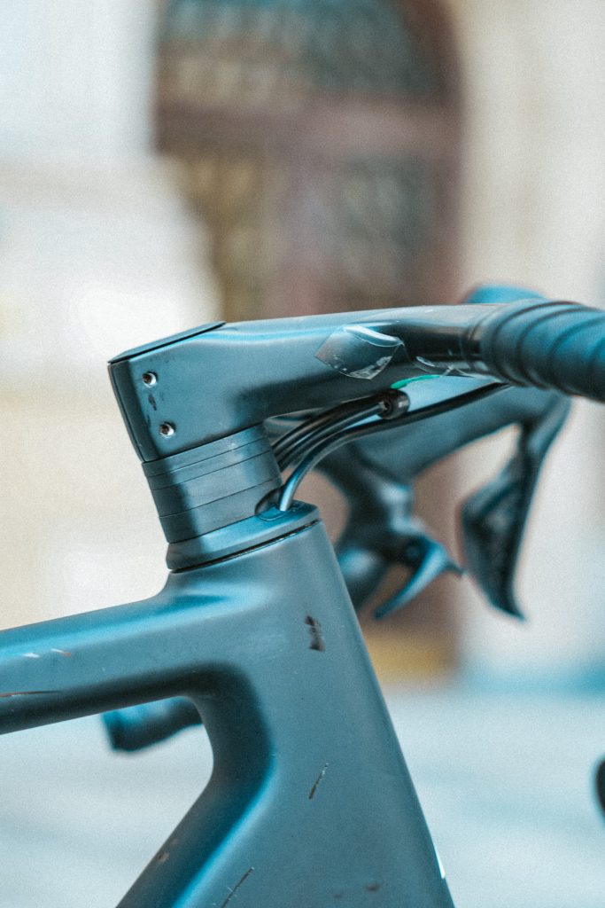 Zamiast klasycznego mostka i kierownicy, mamy zintegrowany monolit CP0047. Kształt „Double Drop” nie jest tylko stylistycznym wymysłem – chodzi o to, że gięcie kierownicy podąża za naturalnym ułożeniem nadgarstków w dolnym chwycie. W praktyce jest po prostu wygodniej. Flara (rozgięcie na boki) jest umiarkowana. To kompromis – daje stabilność w terenie, ale klamki pozostają ustawione pionowo, co nie psuje aerodynamiki.