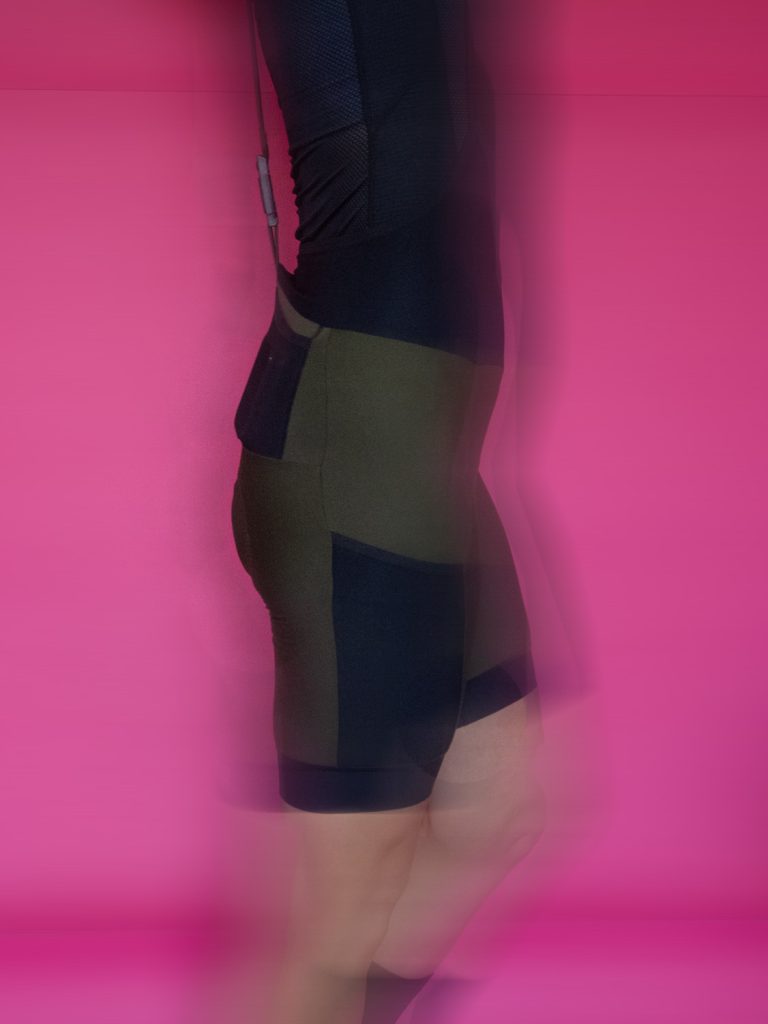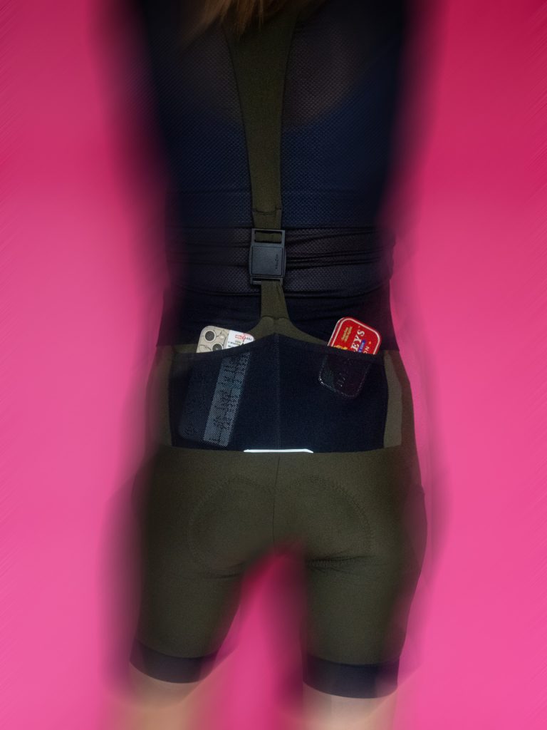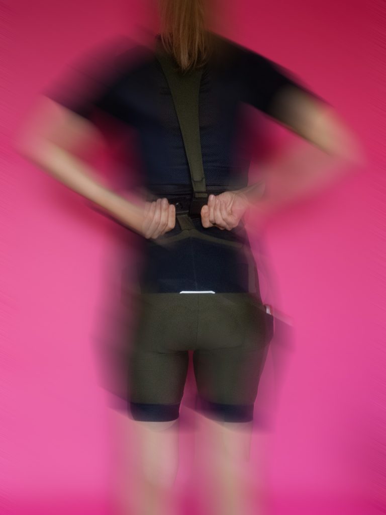 Skonstruowane z trzech różnych materiałów i klamry, tworzą system, który utrzymuje spodenki na miejscu, a jednocześnie poddaje się nie powodując ucisku. Z przodu przymocowane są do szerokiego pasa z elastycznej siateczki, który okala cały tułów nad biodrami i w okolicy pasa – ten fragment szelek wykonany jest z szerokiej, satynowej w dotyku, czarnej, rozciągliwej gumki. Na wysokości obojczyków gumkowy fragment szelek łączy się z materiałowym elementem w kształcie litery Y, który przechodzi na plecy, by tam, w dolnej części znów połączyć się z głównym body spodenek już za pomocą jednego pasa. Magnetyczna klamra Fidlock do rozpinania szelek umiejscowiona została mniej więcej na wysokości wygięcia pleców, tak więc dopóki nie załadujesz kieszonek koszulki po brzegi kanapkami i dętkami, klamra nie ma styczności z ciałem (aparat, który jeździ ze mną, ląduje na plecach powyżej klamry i również z nią nie koliduje).