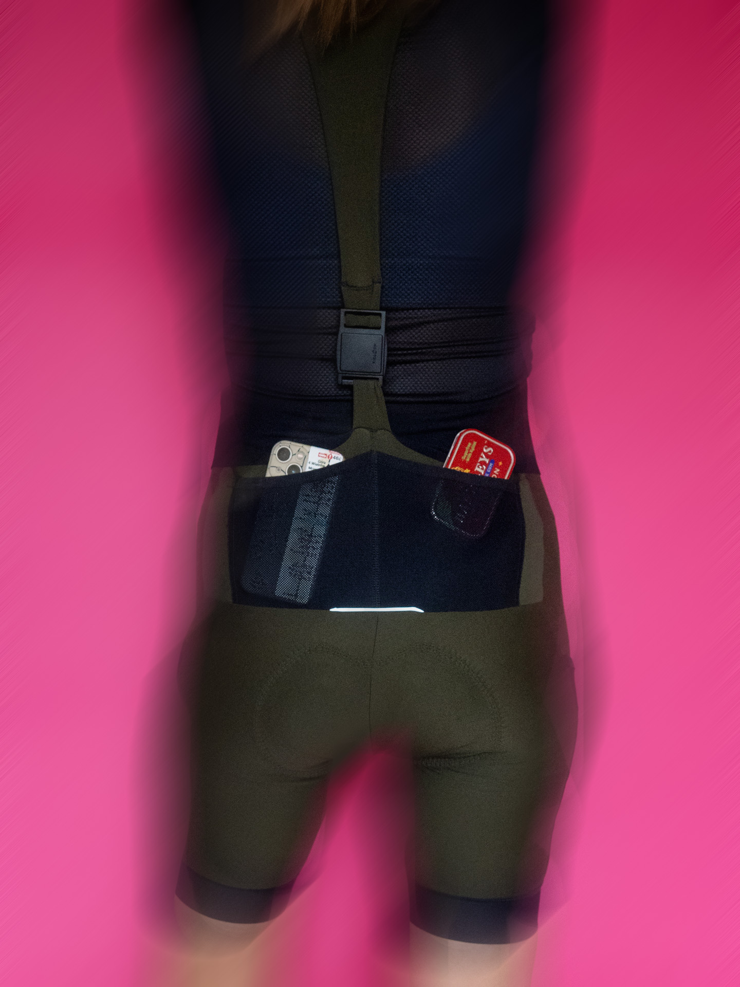Skonstruowane z trzech różnych materiałów i klamry, tworzą system, który utrzymuje spodenki na miejscu, a jednocześnie poddaje się nie powodując ucisku. Z przodu przymocowane są do szerokiego pasa z elastycznej siateczki, który okala cały tułów nad biodrami i w okolicy pasa – ten fragment szelek wykonany jest z szerokiej, satynowej w dotyku, czarnej, rozciągliwej gumki. Na wysokości obojczyków gumkowy fragment szelek łączy się z materiałowym elementem w kształcie litery Y, który przechodzi na plecy, by tam, w dolnej części znów połączyć się z głównym body spodenek już za pomocą jednego pasa. Magnetyczna klamra Fidlock do rozpinania szelek umiejscowiona została mniej więcej na wysokości wygięcia pleców, tak więc dopóki nie załadujesz kieszonek koszulki po brzegi kanapkami i dętkami, klamra nie ma styczności z ciałem (aparat, który jeździ ze mną, ląduje na plecach powyżej klamry i również z nią nie koliduje).