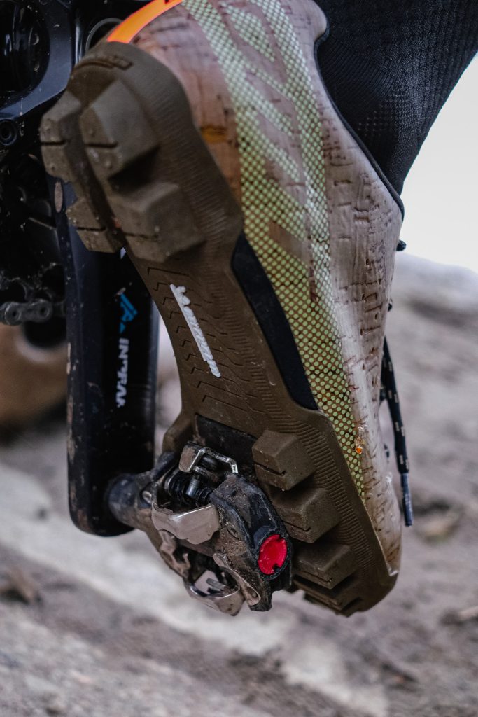 Krawędziowe strefy gwarantują przyczepność w błocie i żwirze, a środkowa – lepszy transfer mocy na pedały. Dodatkowe wzmocnienia przy palcach i pięcie zwiększają trwałość i stabilność podczas prowadzenia roweru.