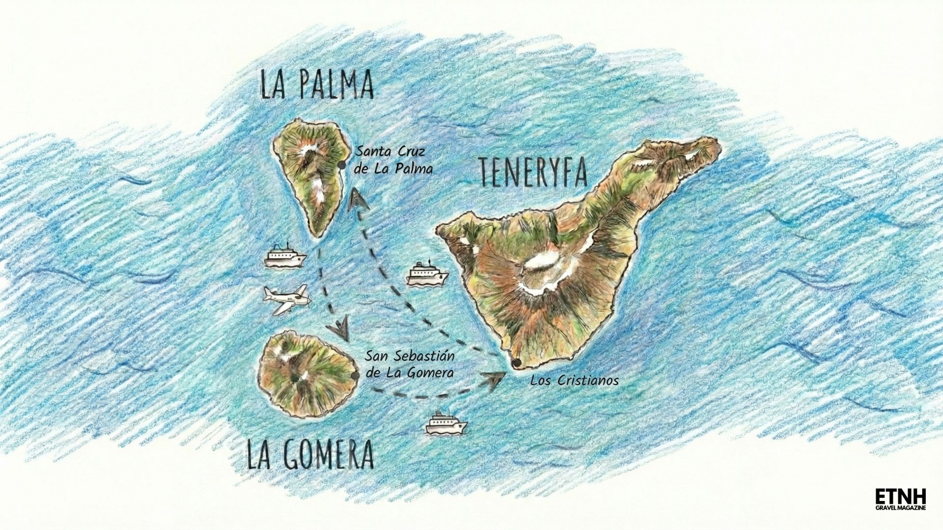 Z La Palmy (Santa Cruz de La Palma) na La Gomerę (San Sebastián de La Gomera) najtaniej dostać się będzie promem (tych samym operatorów) – koszt z rowerem to około 60 euro. Minusem jest jednak czas podróży (najczęściej z przystankiem na Los Cristianos) – to prawie 4h na promie. Rozwiązaniem szybszym jest transfer lotniczy między wyspami (o tym więcej w pkt. 3).
