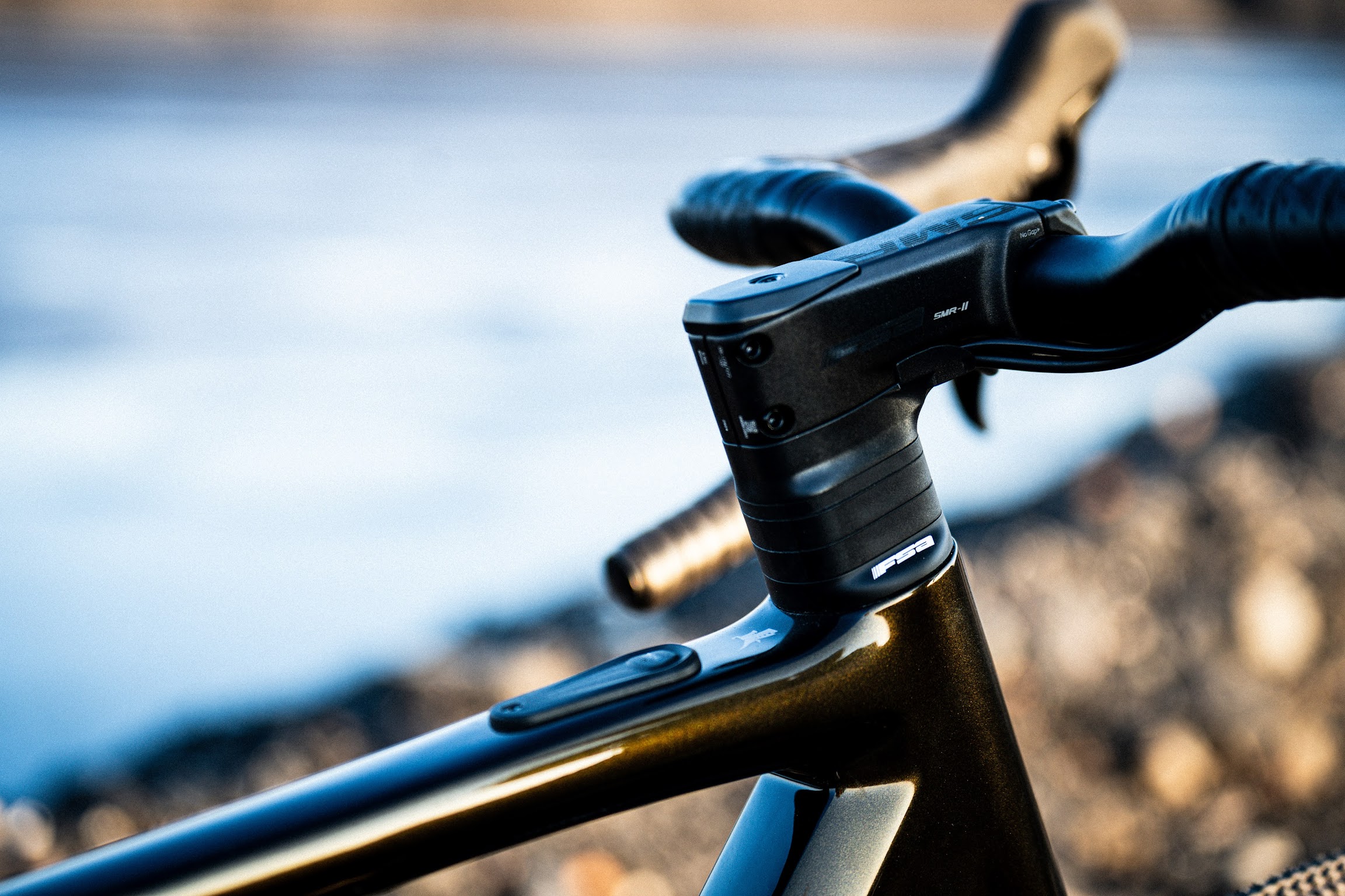 Pół-zintegrowany kokpit opiera się na aluminiowej kierownicy RTM oraz mostku FSA. Całość uzupełnia owijka o wysokiej gęstości Fizik, przyjemnie wygodne siodło Selle Royal SRX Athletic oraz karbonowa sztyca o aero przekroju.
