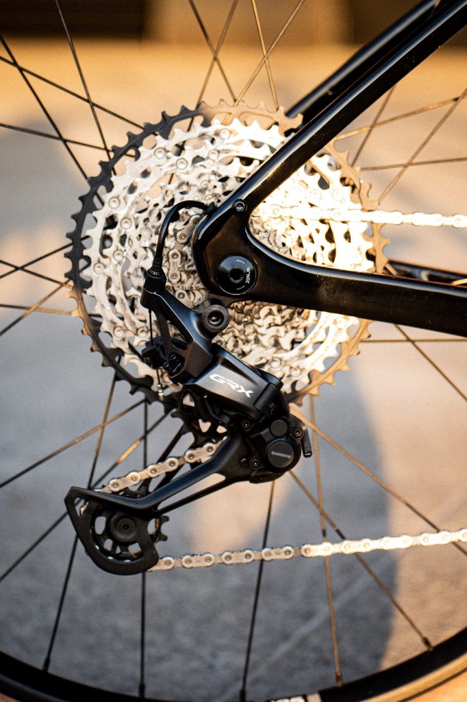 Romet E-NYK 1.0 został skonfigurowany w oparciu o gravelową Shimano GRX w jej najnowszej, 12-rzędowej odsłonie. Wybór ten determinuje charakter napędu, stawiając na mechaniczną precyzję i odporność na trudne warunki terenowe.