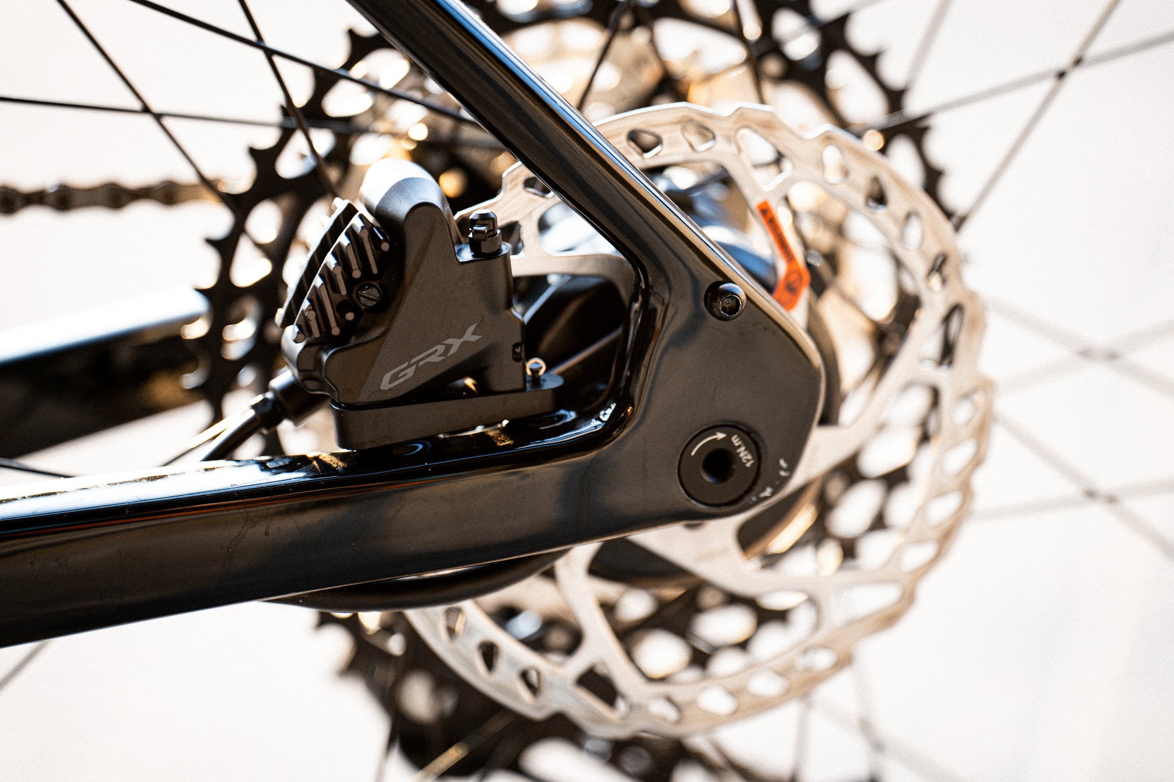 Układ napędowy oparto na konfiguracji 1×12 z przednią tarczą 40T (korba FC-RX610) oraz kasetą o szerokim zakresie 10-51T z serii SLX M7100. Taki zestaw oferuje rozpiętość przełożeń wynoszącą 510%. W specyfice roweru elektrycznego tak zestopniowana kaseta ułatwia utrzymanie wysokiej kadencji na stromych podjazdach, co bezpośrednio przekłada się na efektywność pracy silnika Mahle. Za zmianę biegów odpowiada przerzutka tylna RD-RX822. Za wytracanie prędkości odpowiadają hydrauliczne hamulce tarczowe z GRX (klamkomanetki ST-RX610 i zaciski BR-RX400).